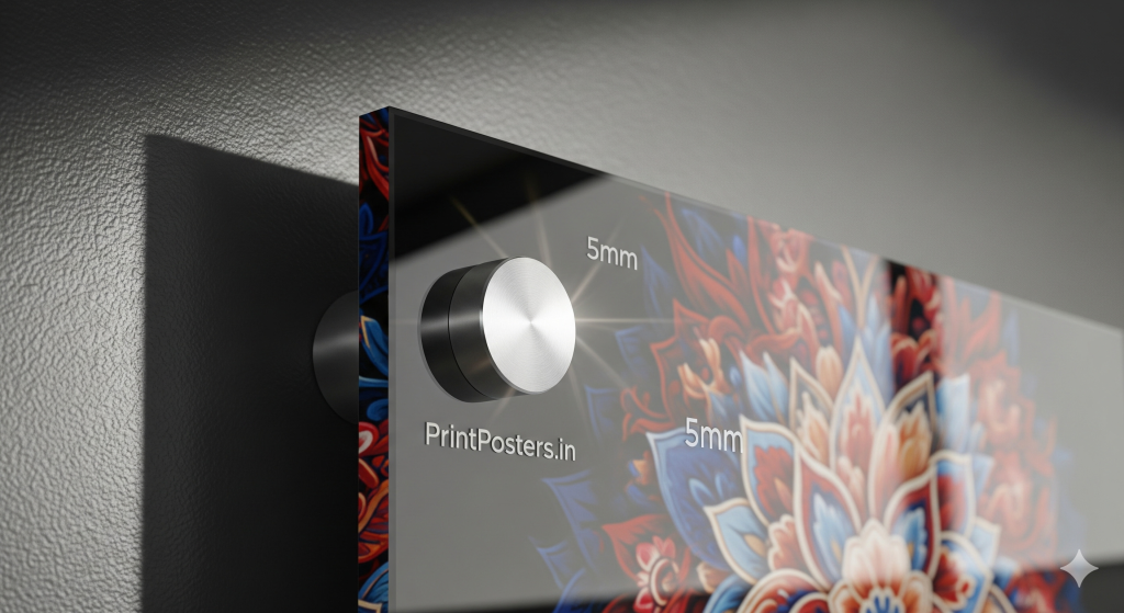 - Standoff-Mounted Frames: For a professional, gallery-quality presentation, standoff mounting is the premier choice. This method uses cylindrical metal hardware—known as standoffs or studs—to mount the acrylic panel a short distance away from the wall.33 This separation creates a subtle shadow and adds a sense of depth and importance to the display. The standoffs themselves, often made of materials like stainless steel or nickel-plated metal, become a deliberate part of the aesthetic.34 Companies like PrintPosters.in utilize sturdy stainless steel studs for larger frames (12×18 inches and above) to ensure both stability and a sleek, modern finish.2